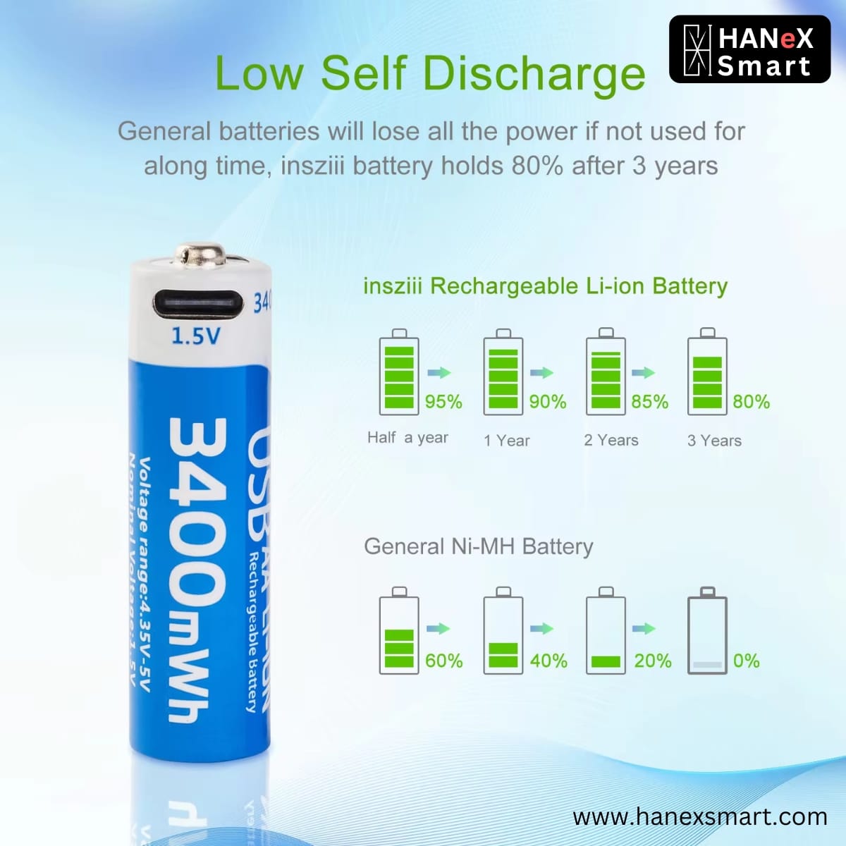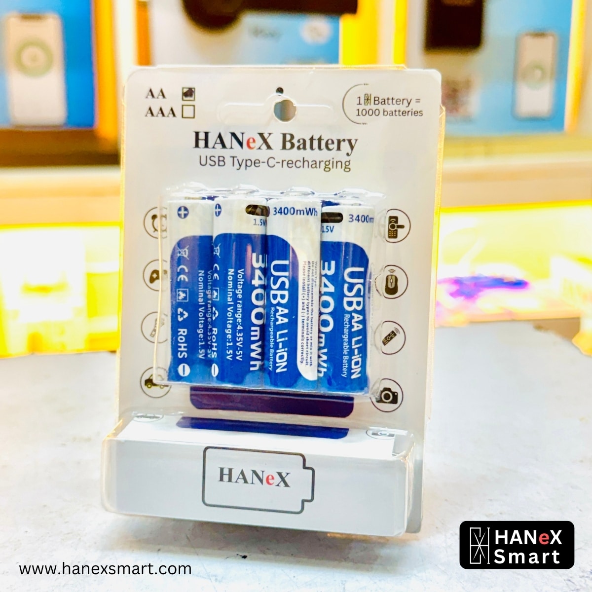 The Hanex AA 4 Pcs Rechargeable Battery 3400 mWh with Charging Type-C is a modern, eco-friendly, and high-performance power solution designed to meet today’s energy demands. Whether you use batteries for remote controls, wireless mouse, keyboards, gaming controllers, toys, cameras, microphones, clocks, or other electronic devices, Hanex ensures stable, reliable, and long-lasting power every time.